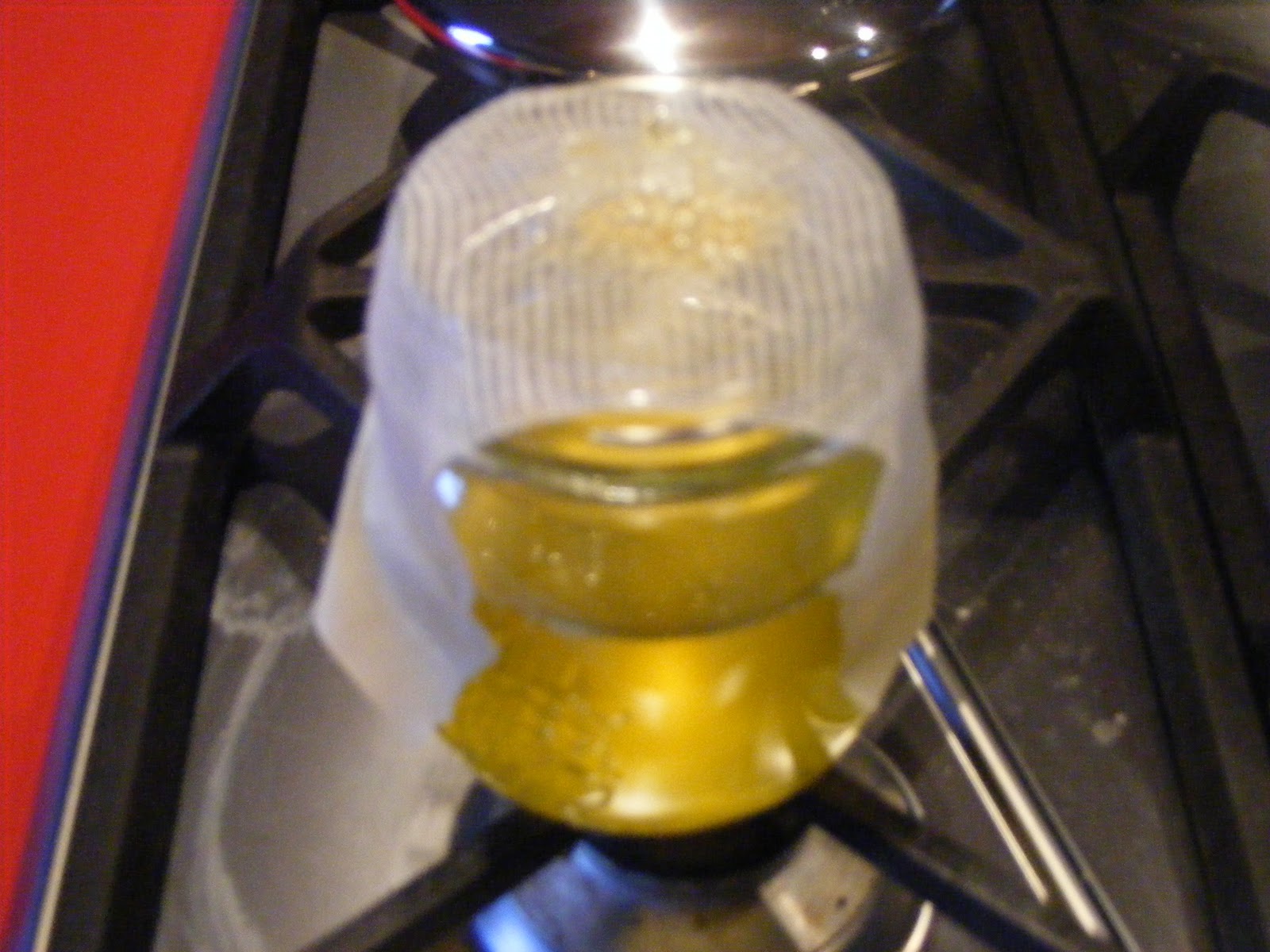 Ora assume un colore giallo paglierino pulito.Appena noto che sui bordi sta per caramellare, spengo la fiamma.Munita di una garza filtro il liquido in un vasetto di vetro e lo lascio riposare per un pò di ore a temperatura naturale.