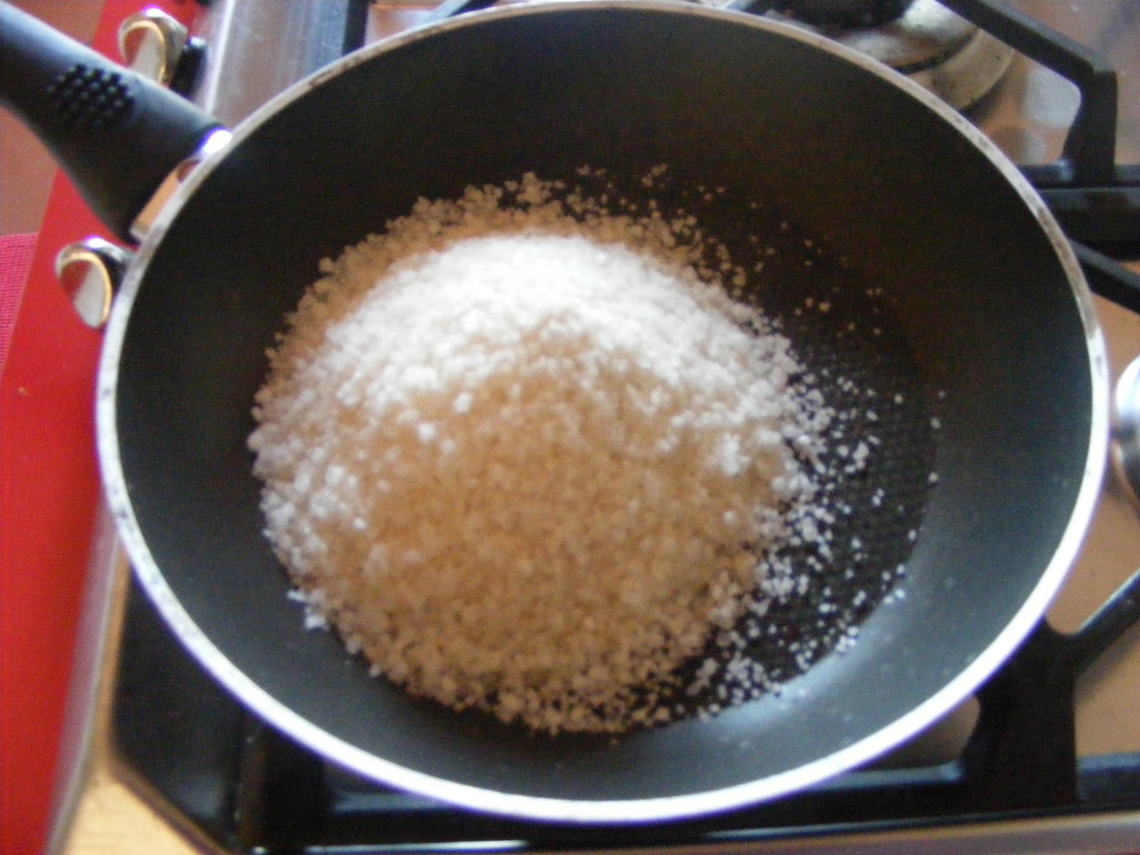 Basta prendere del sale grosso, circa 500 g e mettilo in una padella antiaderente lasciando che si scaldi.