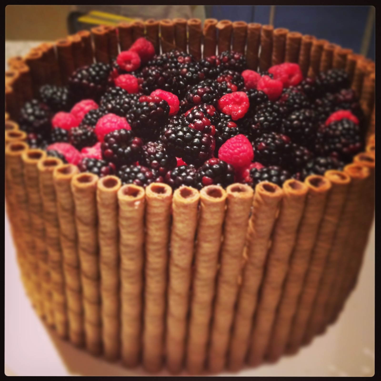 Tieni la torta in frigo per 2-3 ore; dopodichè lava la frutta, asciugala e disponila in questo bellissimo “recinto di cioccolata”.