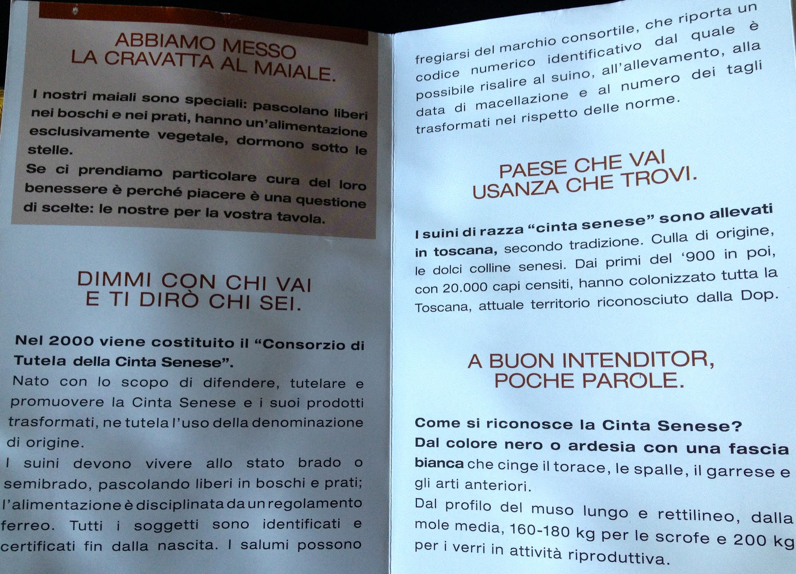 “I suini di razza “cinta senese” sono allevati in Toscana, secondo tradizione. Culla di origine, le dolci colline senesi. Dai primi del ‘900 in poi, con 20.000 capi censiti, hanno colonizzato tutta la Toscana, attuale territorio riconosciuto dalla Dop.”