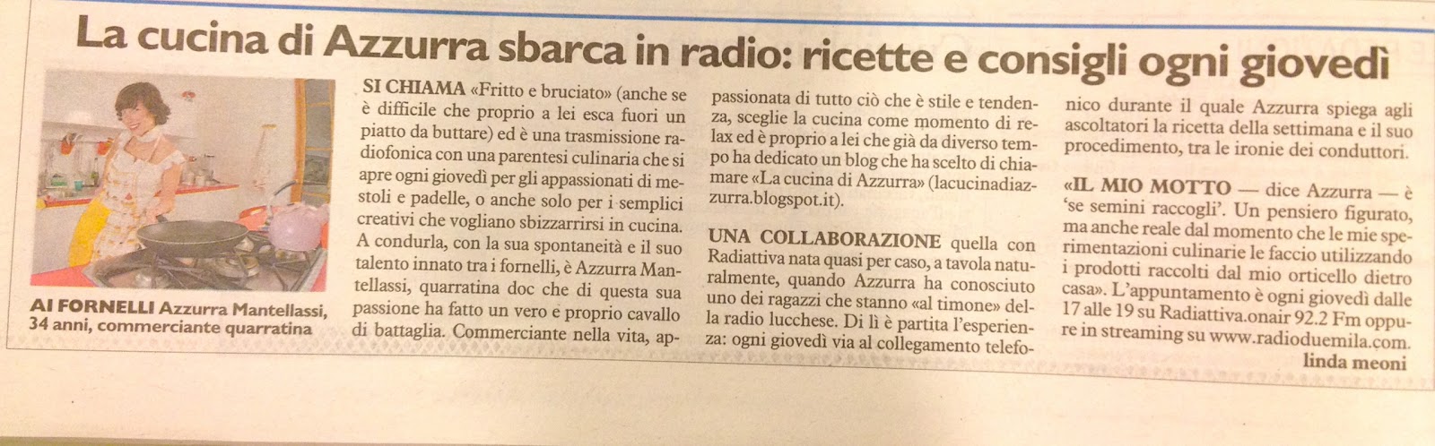 Oggi mi sono svegliata presto con l’impaziente desiderio di rendervi partecipi di ciò che mi è successo alcuni giorni fa. Sulla Nazione cronaca Pistoia-Montecatini è stato pubblicato un articolo su Lacucinadiazzurra e il suo sbarco in Radio!!!