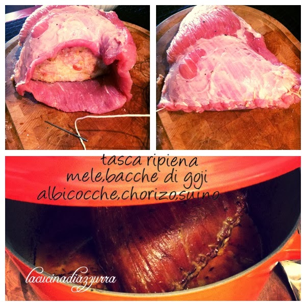 mele golden, chorizo, albicocche essiccate, bacche di goji, una manciata di pane grattugiato e una di formaggio grana, finocchietto selvatico, pepe e timo.