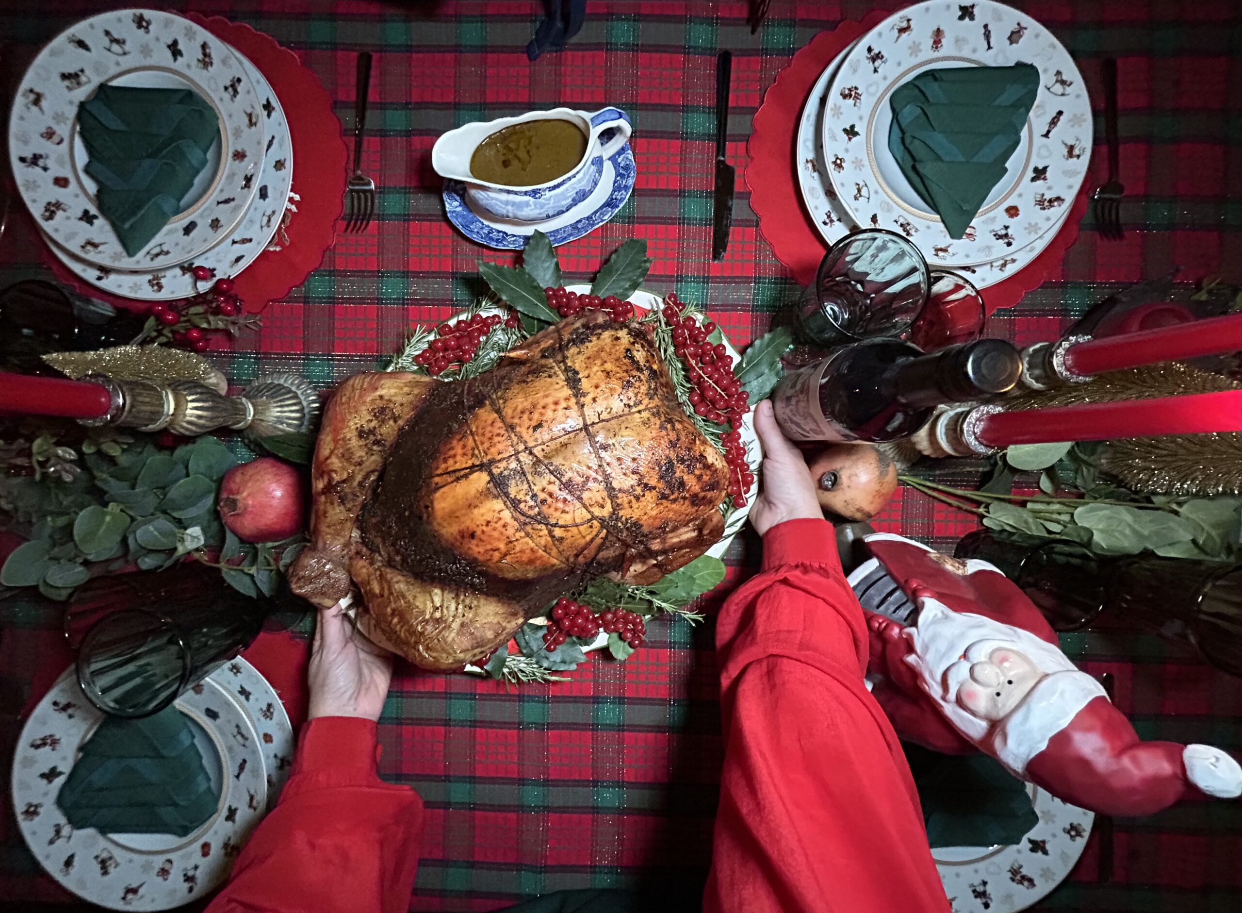 La mia casa vestita a Natale, l’albero già fatto, lucine in sfondo e un tacchino ripieno da servire.