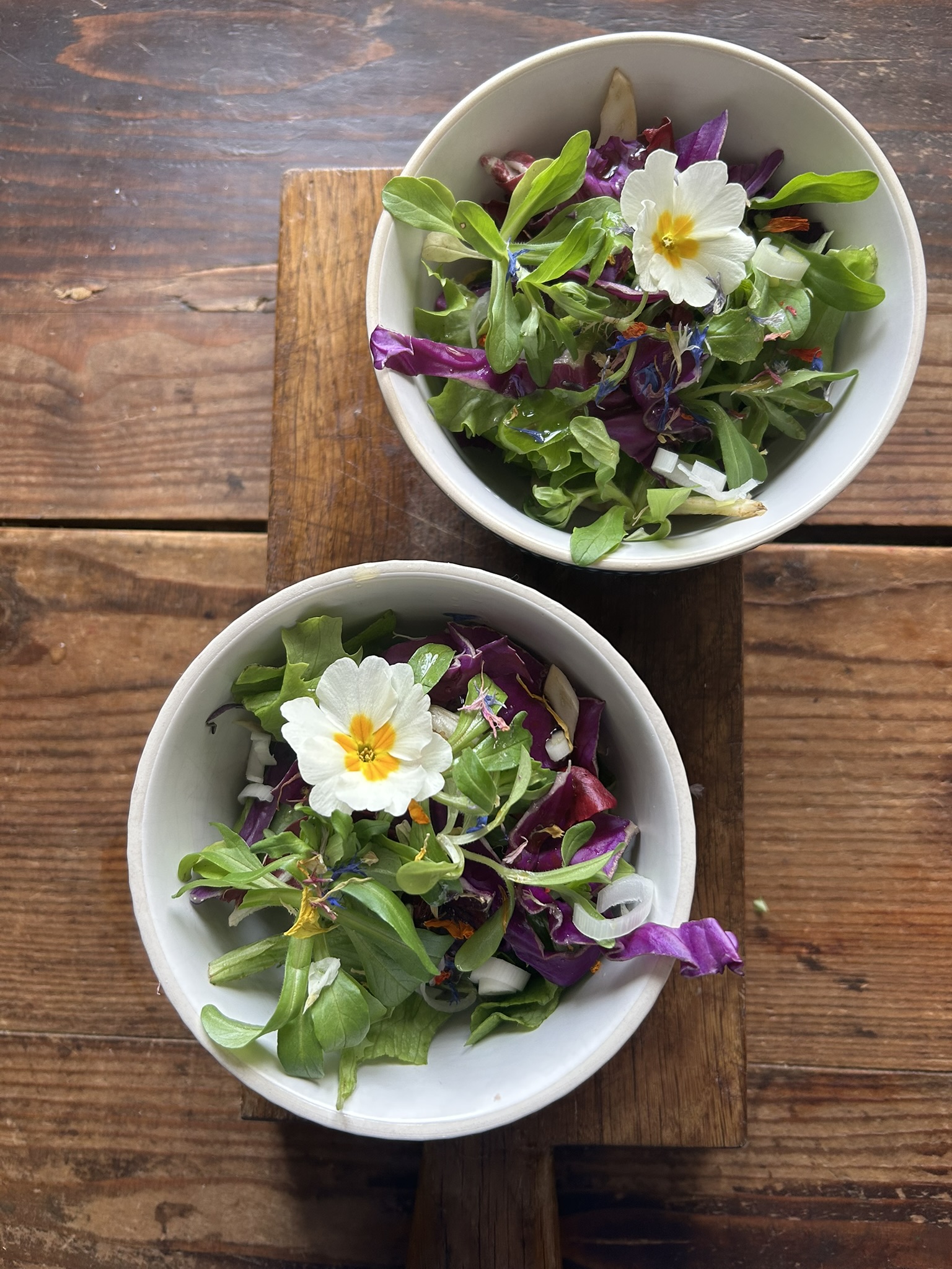 Insalatina mista di campo lavata bene e strizzata, aggiungi olio sale e aceto o limone se ti piace di piu e per servire fiori eduli